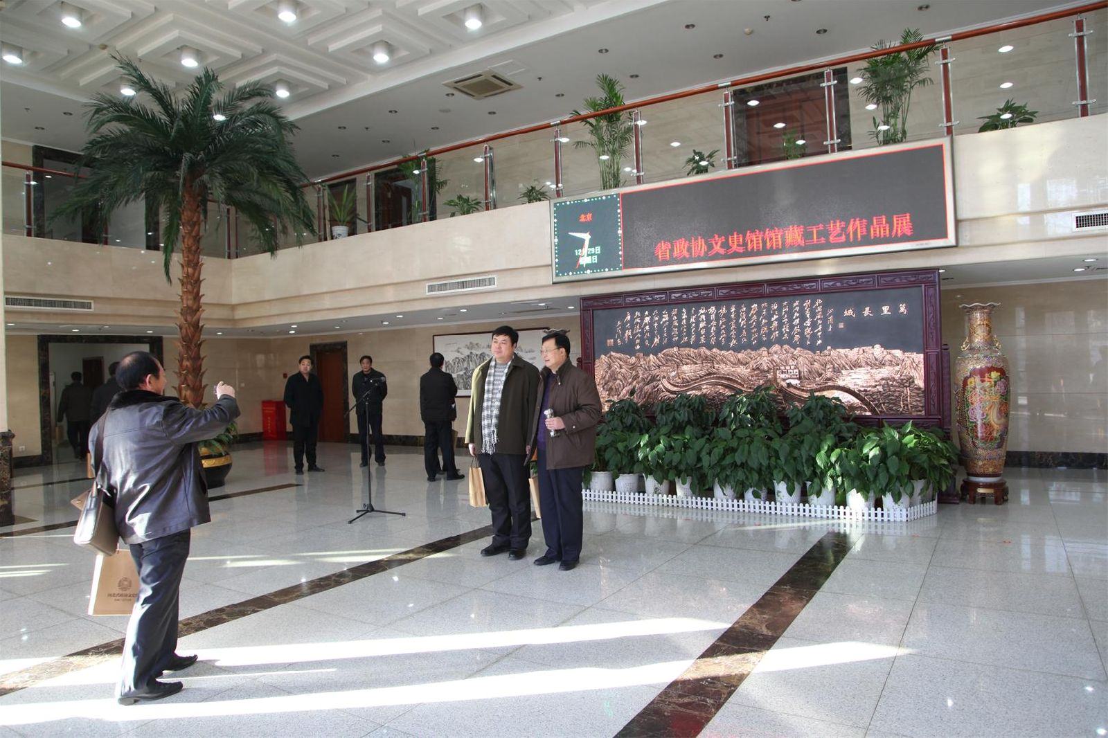 河北省文史館館藏作品展暨文史工作平臺建設(shè)座談會2013年12月29日在省會石家莊舉行。縣政協(xié)主席劉海明、鄭氏砂藝公司總經(jīng)理鄭鐵軍、副總經(jīng)理方永成應(yīng)邀參加了本次活動。座談會由省政協(xié)副主席曹素華主持,省政協(xié)主席付志方、省委常委、統(tǒng)戰(zhàn)部長范照兵、省委常委、宣傳部長艾文禮、副省長楊汭出席大會并做重要講話。省政協(xié)副主席段惠軍、崔江水、曹素華、 盧曉光、省政協(xié)秘書長郭大建以及省內(nèi)著名書畫家、藝術(shù)家近百人參加了參觀和座談會活動。興隆縣鄭氏砂藝的《梅蘭竹菊》、《臉譜組合》、《青山疊翠》、《花鳥牡丹》共7幅作品被省文史館收藏。色彩靚麗的鄭氏金銀絲彩嵌砂畫,贏得了省領(lǐng)導(dǎo)以及與會專家學(xué)者的高度贊賞。