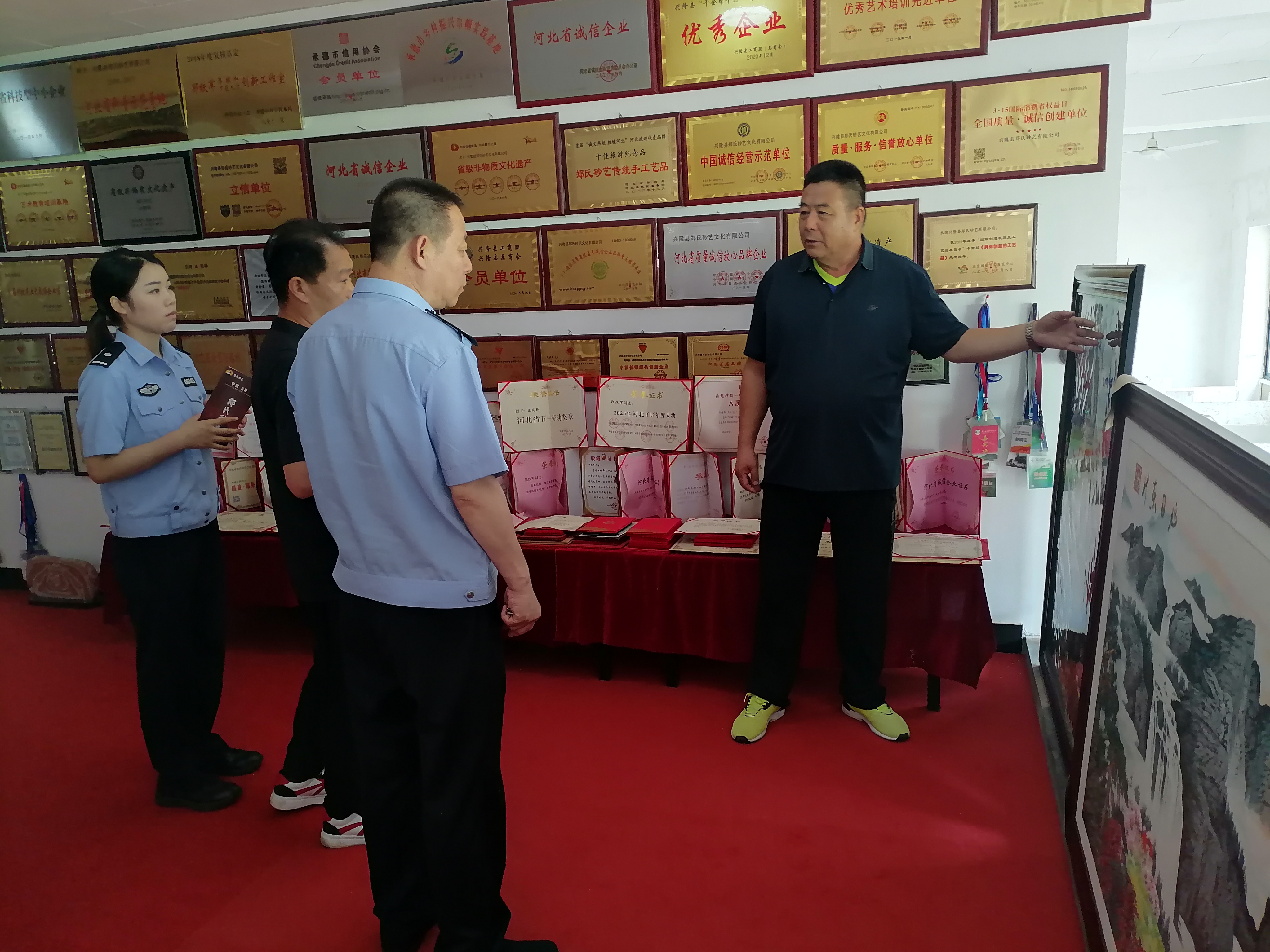 2024年7月23日,承德公安交警支隊領導一行蒞臨鄭氏砂藝參觀考察,并攜手鄭氏砂藝共同推出了“交通安全三十訣”系列鄭氏砂藝作品。