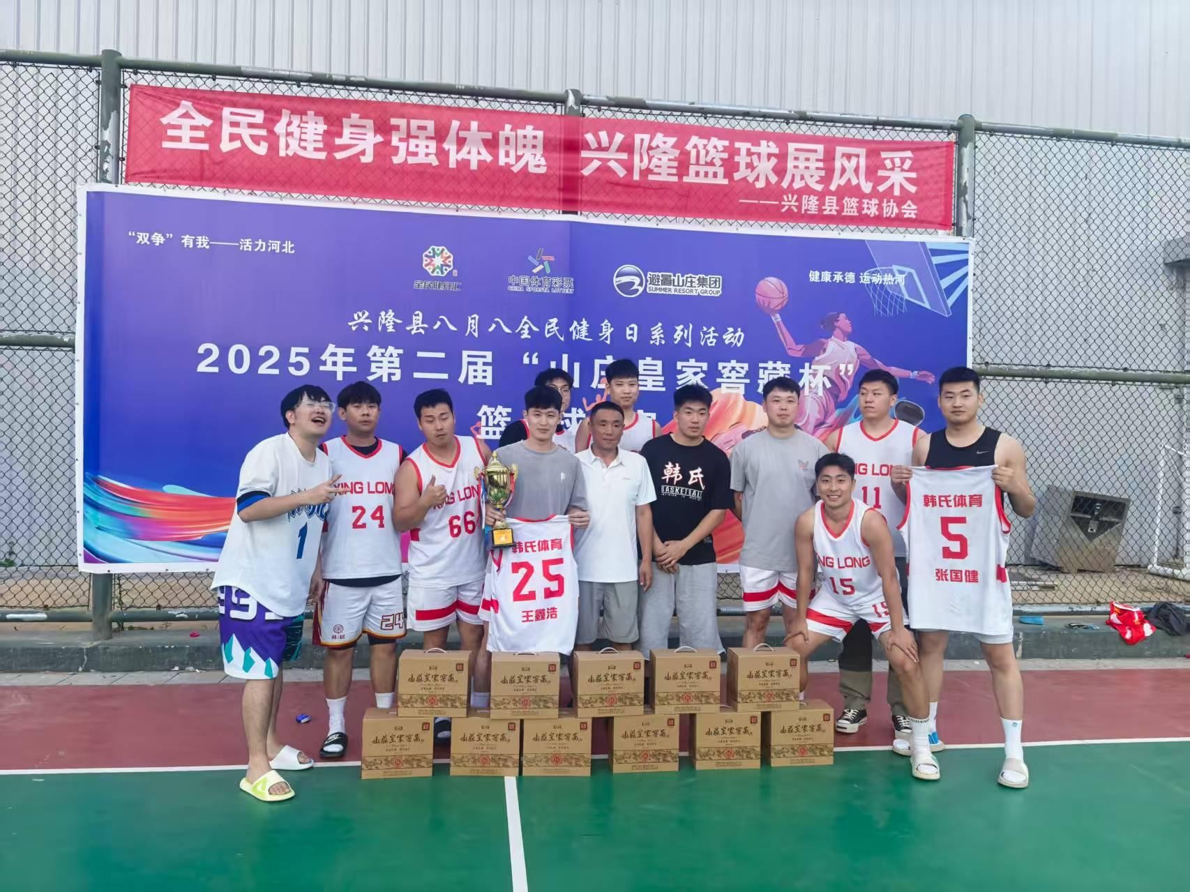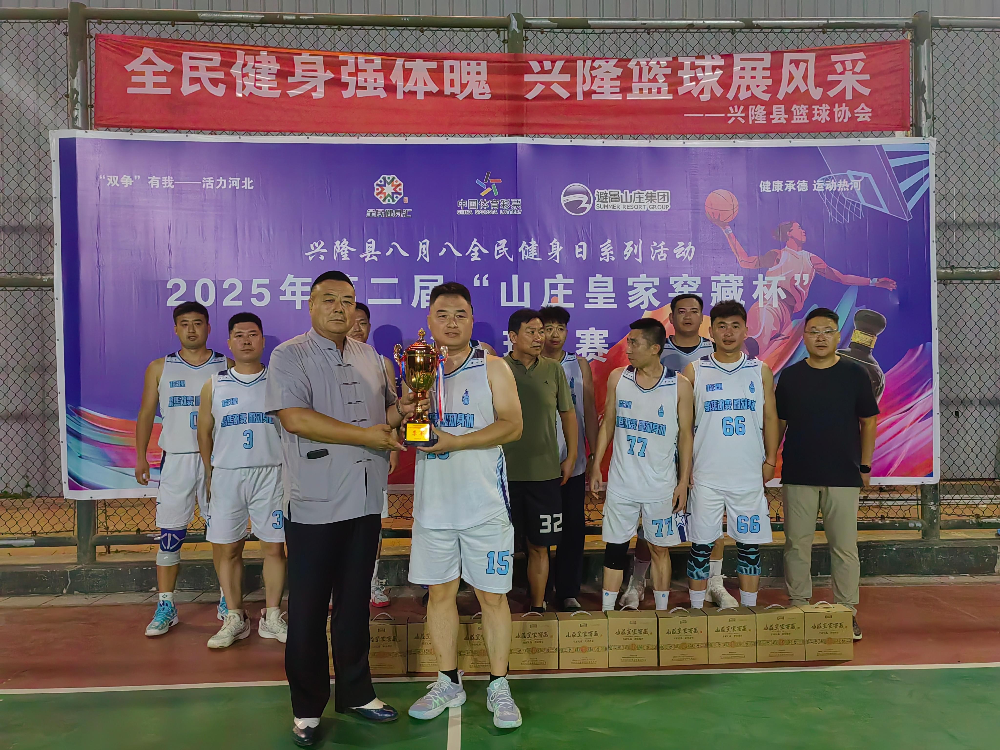 2025年8月31日晚,興隆縣后苗圃人民體育公園內,由興隆縣教育和體育局、興隆縣籃球協會聯合主辦的興隆縣全民健身日第二屆“山莊皇家窖藏杯”籃球挑戰賽圓滿落幕。歷經8月30日至31日兩天的激烈角逐,來自全縣各鄉鎮、縣直單位、企業、學校及民間籃球愛好者組成的12支代表隊奮力拼搏,最終韓氏體育代表隊勇奪冠軍,凱興化工代表隊獲得亞軍,梳理普拉提代表隊摘得季軍。